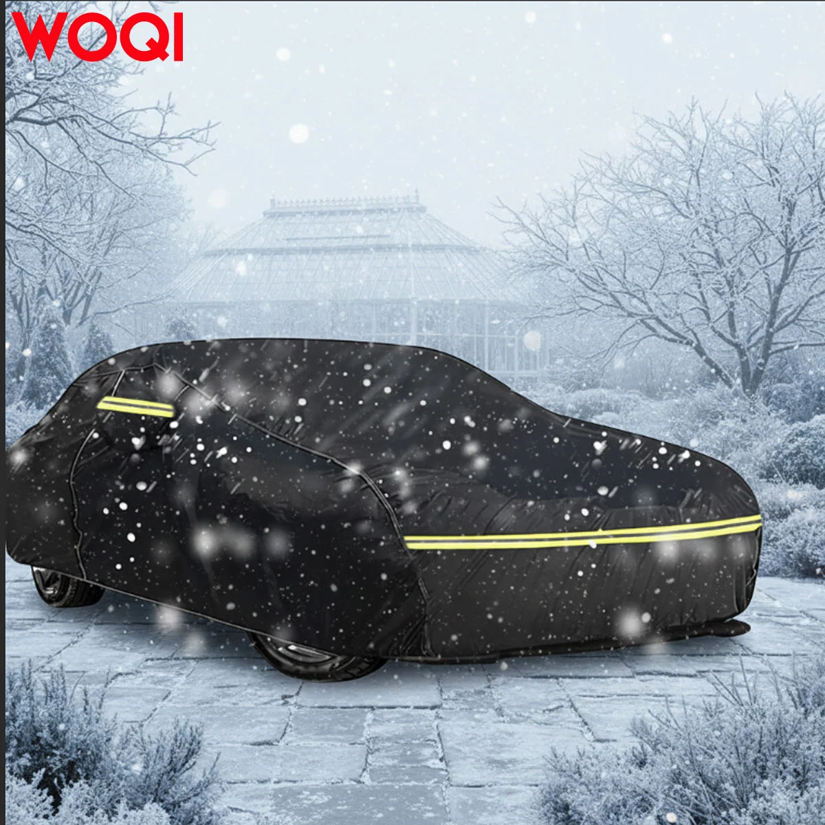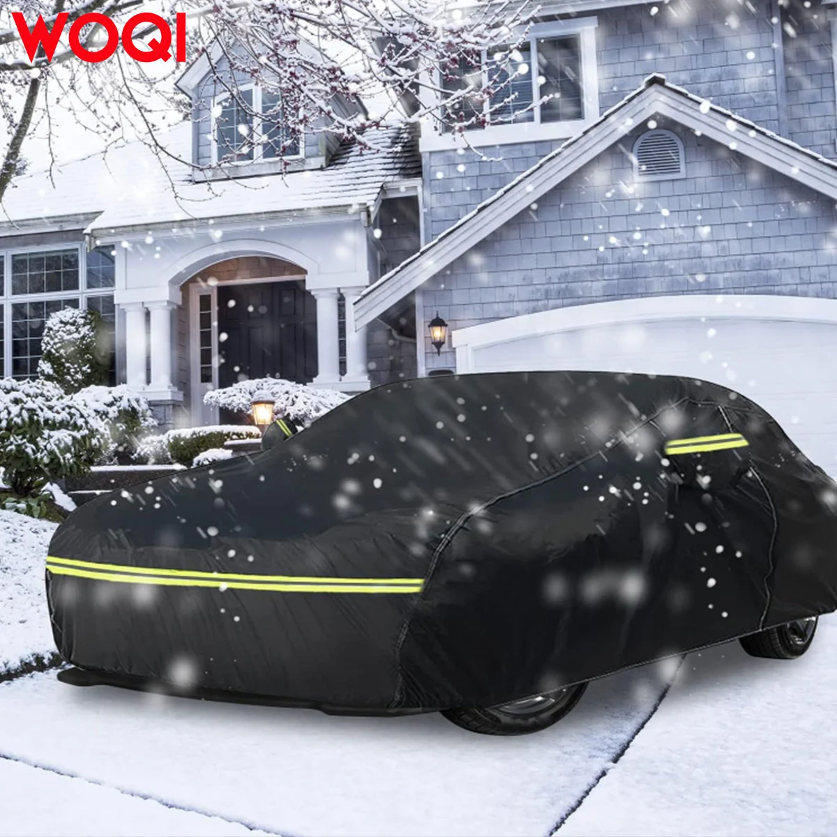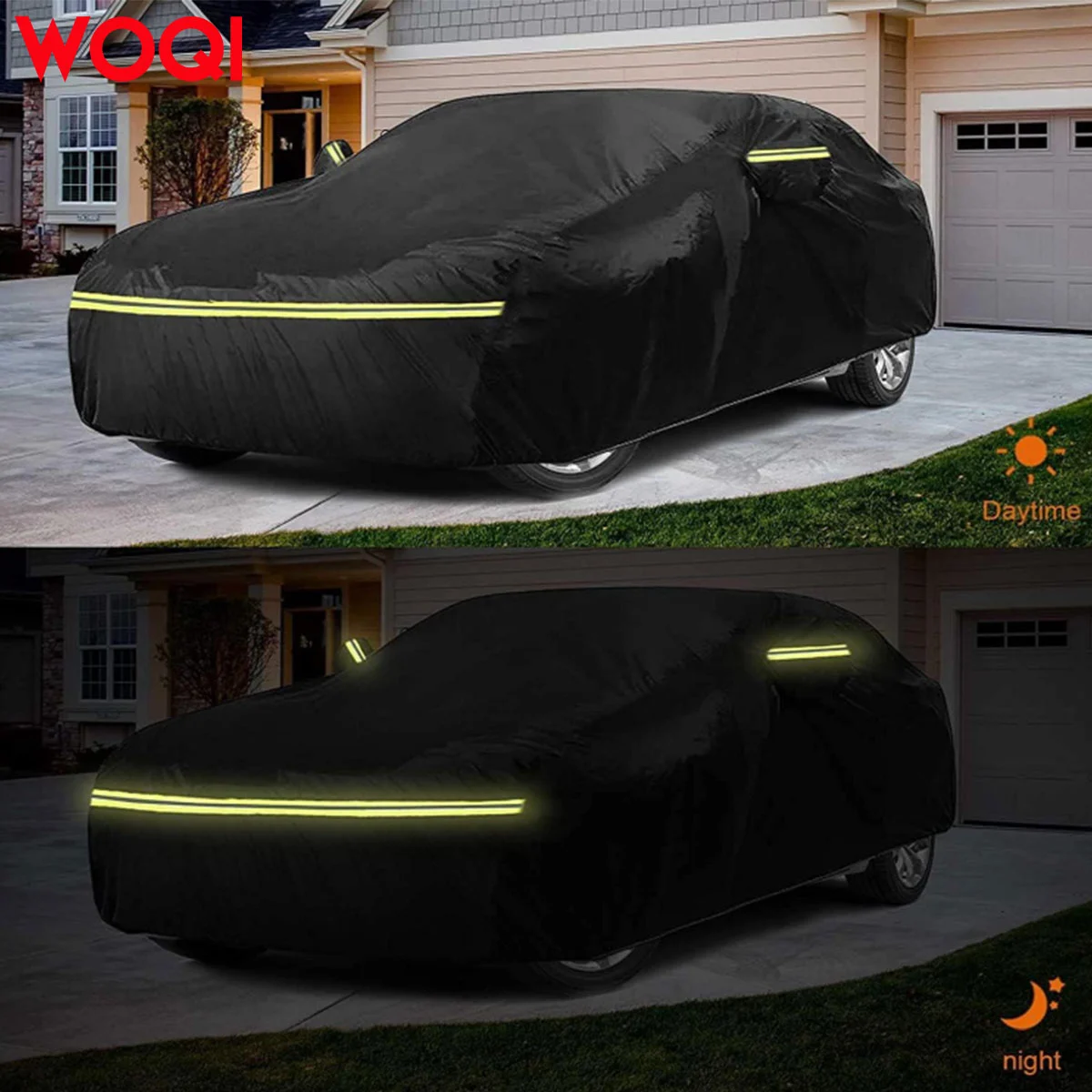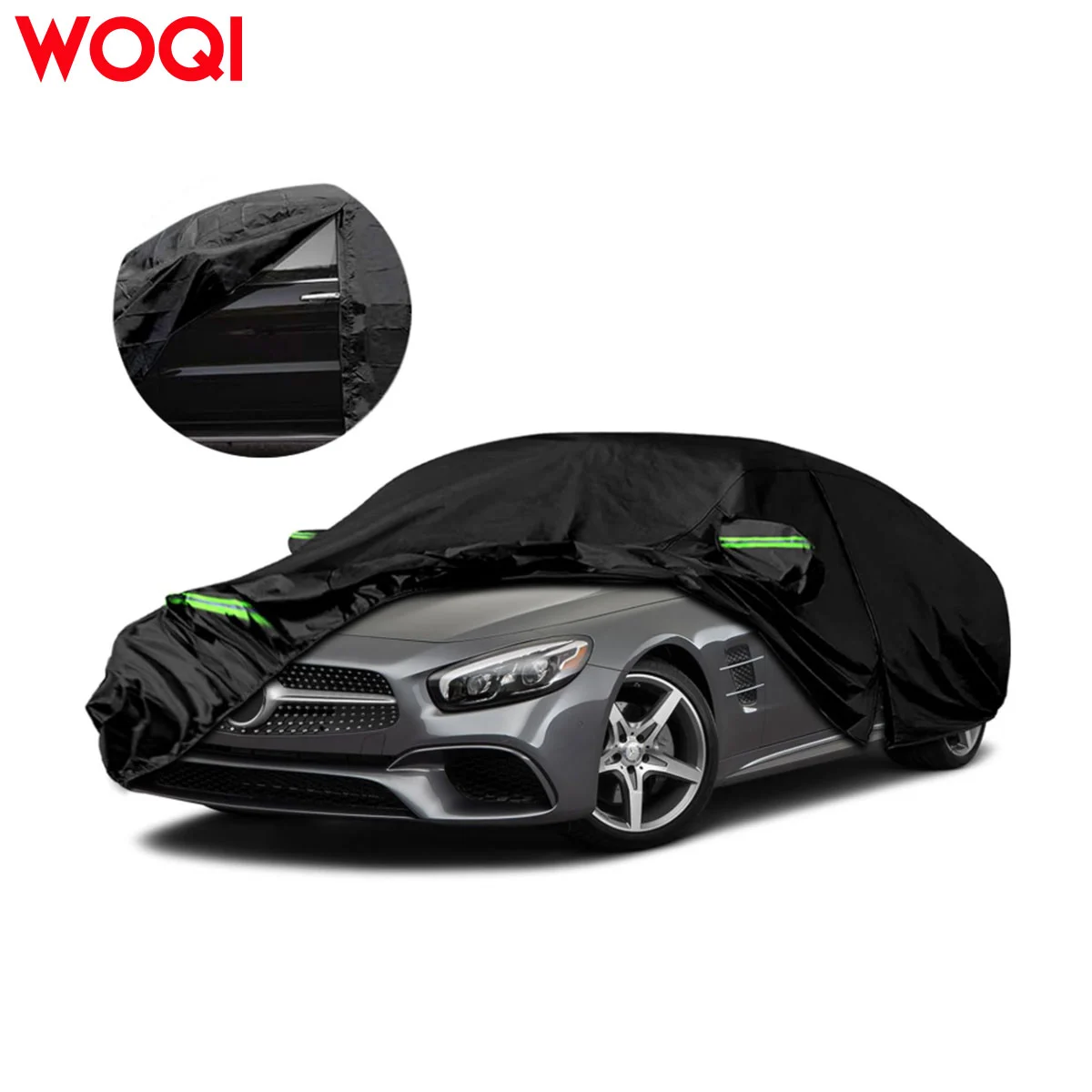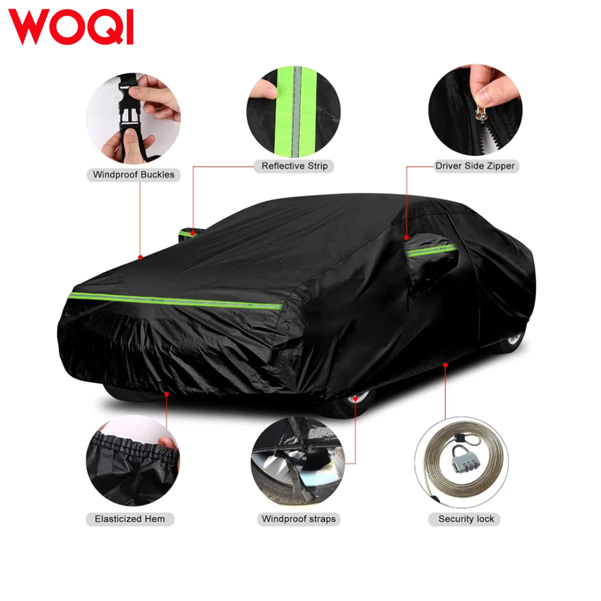 Design Details: 1. Zipper on the left side for easy access. 2. Windproof straps at the front and back to secure the cover in windy conditions. 3. Reflective strips to alert people at night. 4. Stylish mirror pockets to perfectly protect your mirrors from damage. 5. Elastic hem at the bottom for adjustable sizing, allowing easy fit. 6. Four tie-down straps to secure the cover to all four wheels, preventing it from blowing away in strong winds.