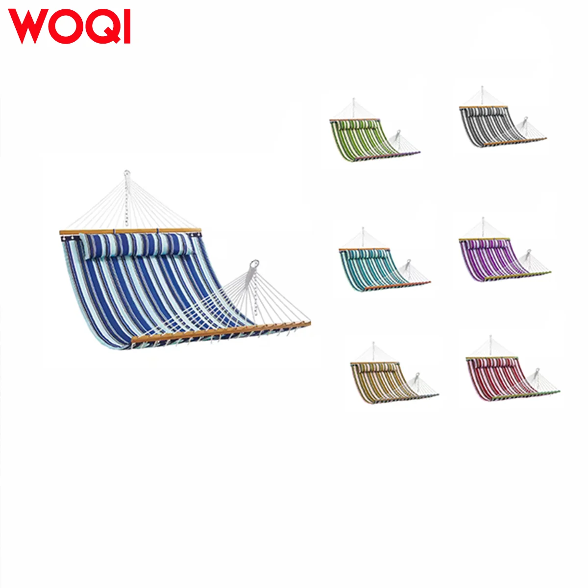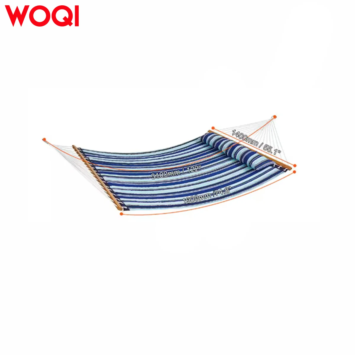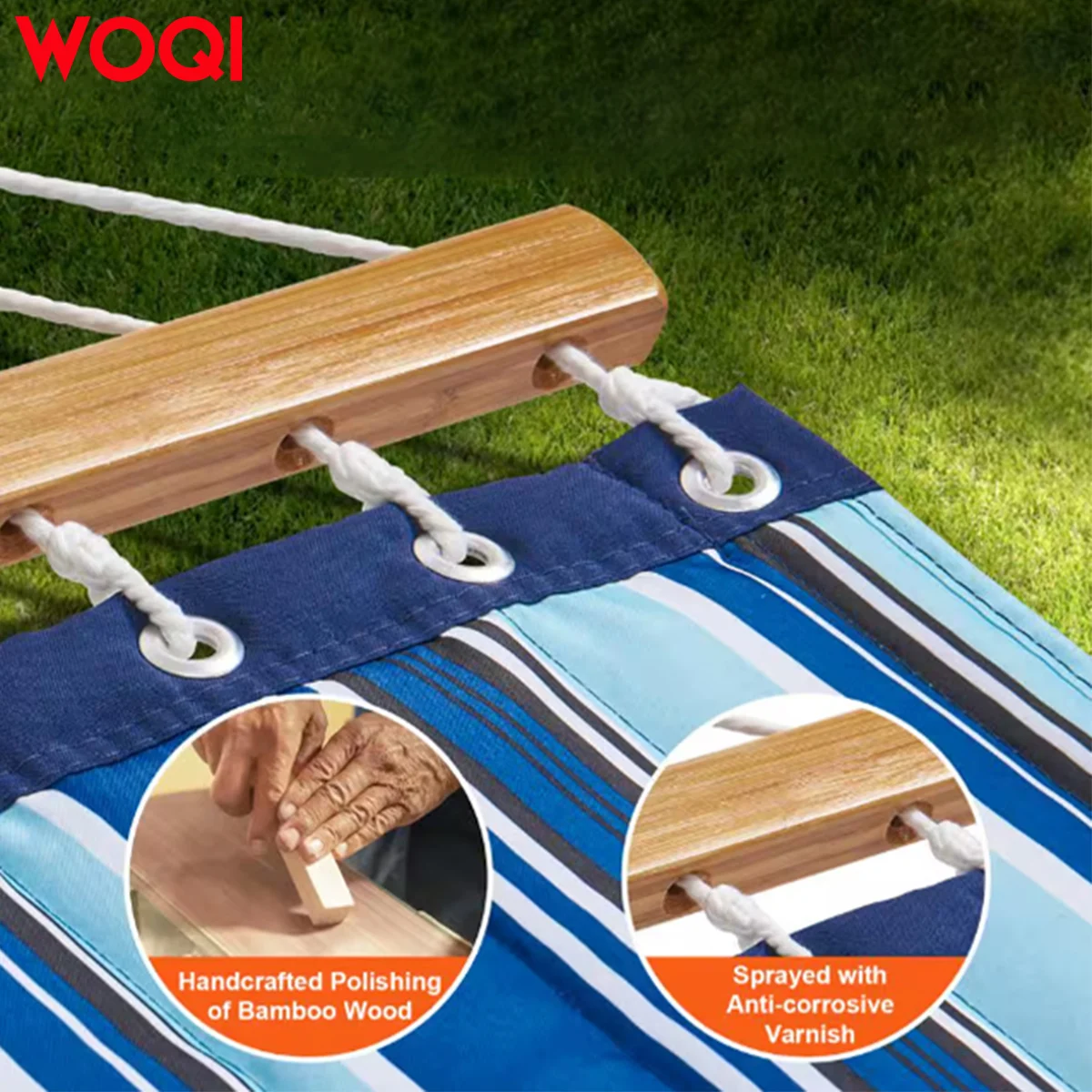 Quilted hammock: double quilted polyester fabric, filled with polyester fiber and headrest filled with polyethylene, providing excellent comfort. Hardwood poles are treated with oil rubbing, which has weather resistance and stability. The polyester rope at the end of the hammock is hand-woven by hammock craftsmen, which is durable, and the thickness of the rope end also helps to maintain the balance and strength of the hammock.