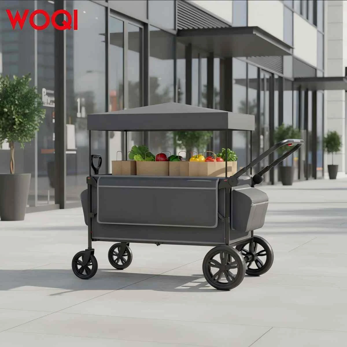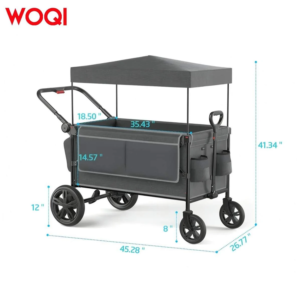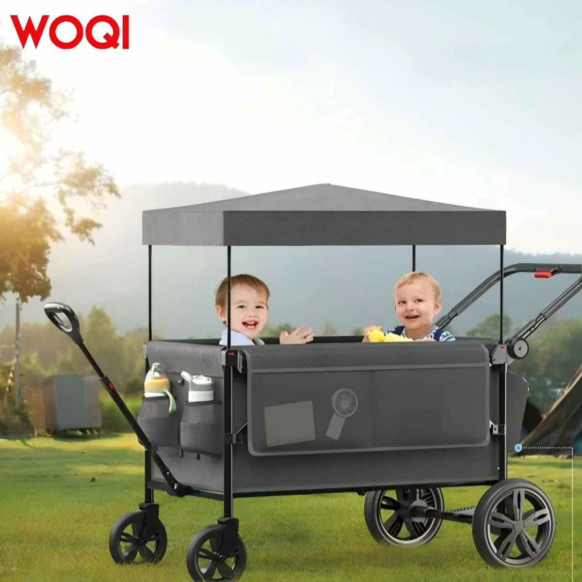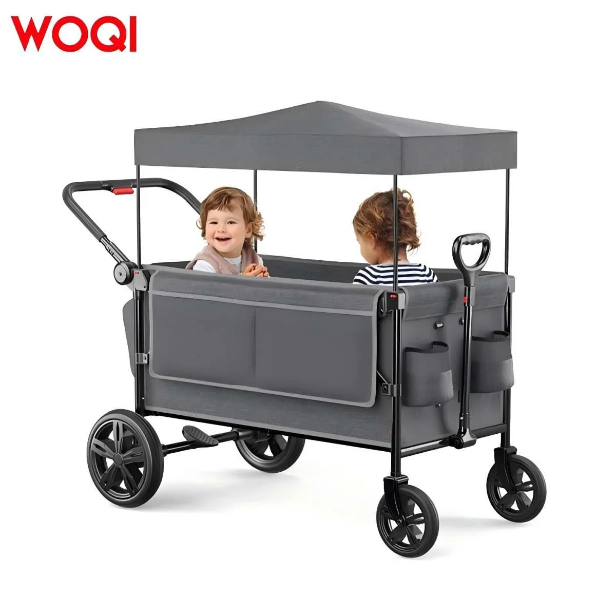 SAFE FOR KIDS: Toddler stroller built-in 5-point harness belt and 2 face-to face seats. Heavy duty steel frame holds up to 110lbs(55lbs per seat). Foot brakes on each wheel to control 360° rotating and linear rolling. Children wagon with canopy made of UPF 50-plus fabric shield sensitive skin from the sun’s harmful rays. Our foldable wagon strollers have the JPMA certified meet ASTM standard