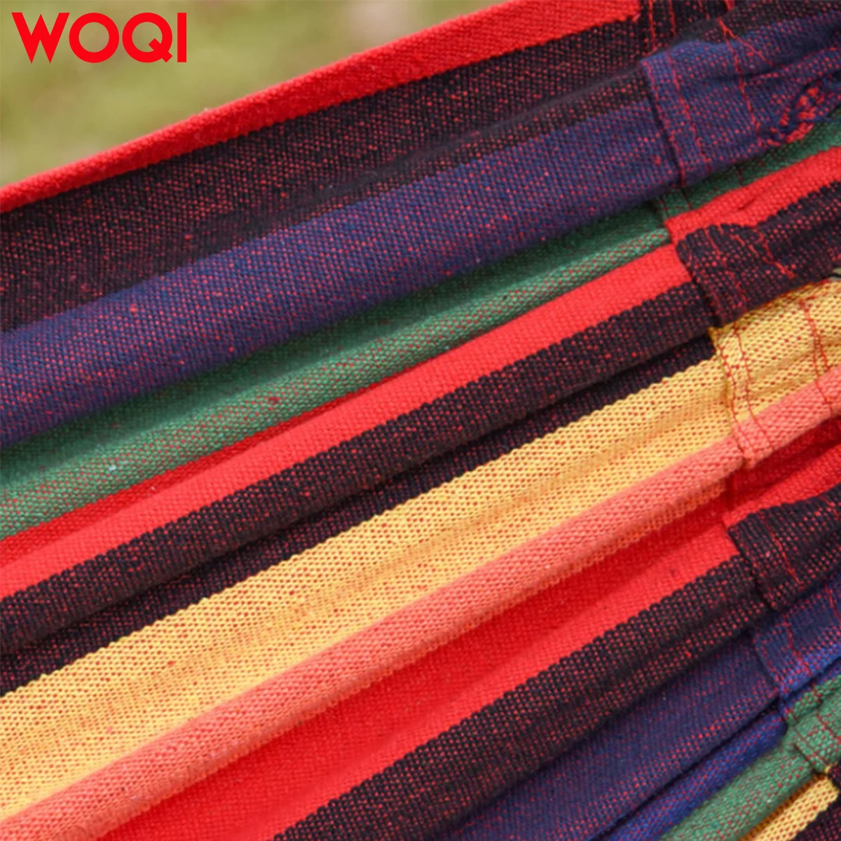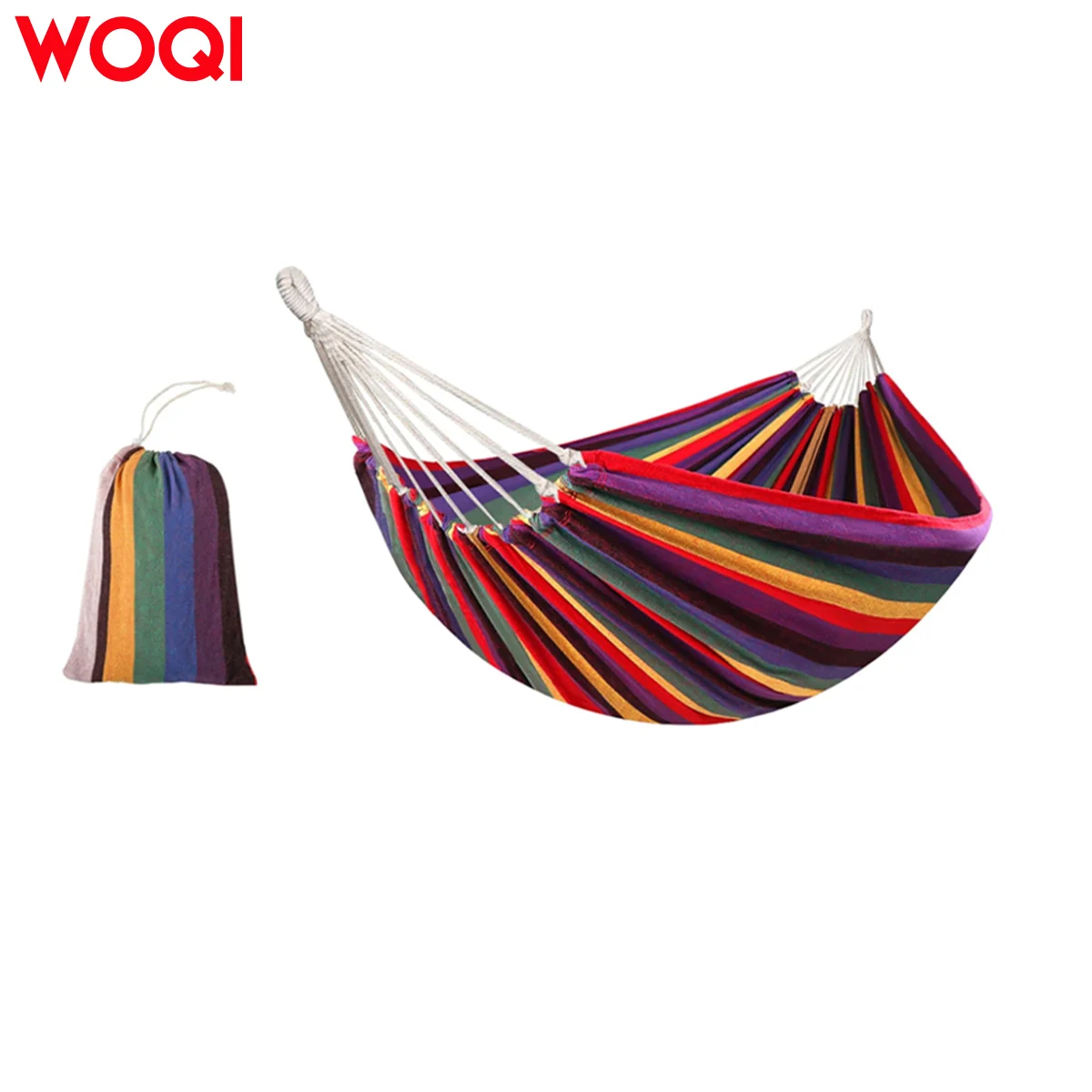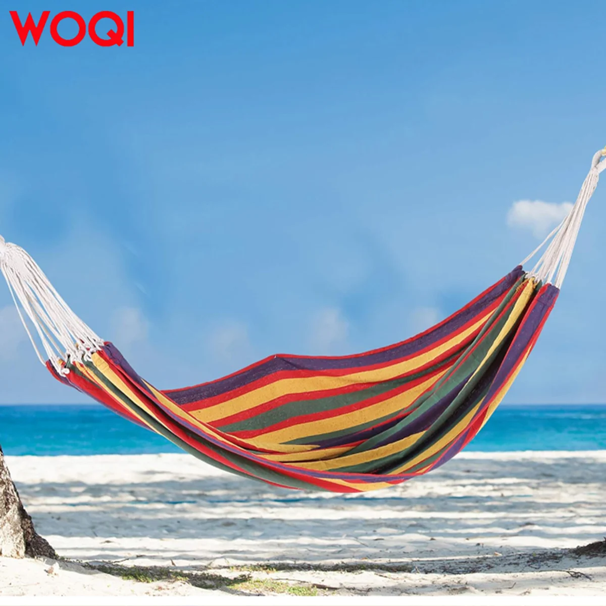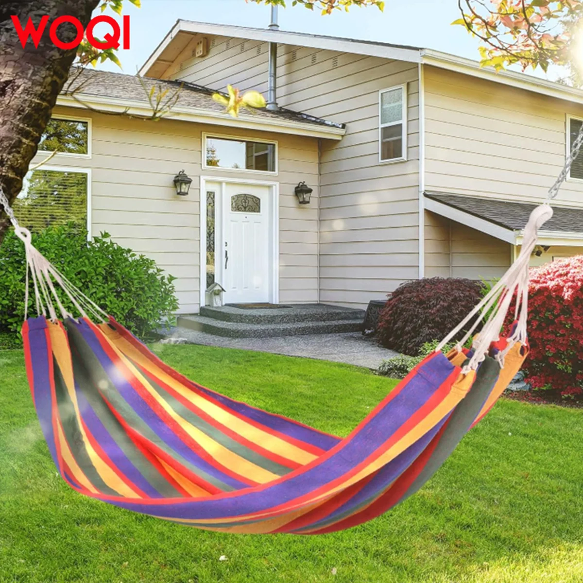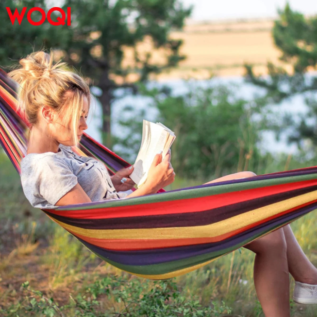 【Portable Hammock】: This cotton hammock can be easily folded into a compact size and comes with a separate storage bag with a drawstring, making it convenient to carry like a backpack.