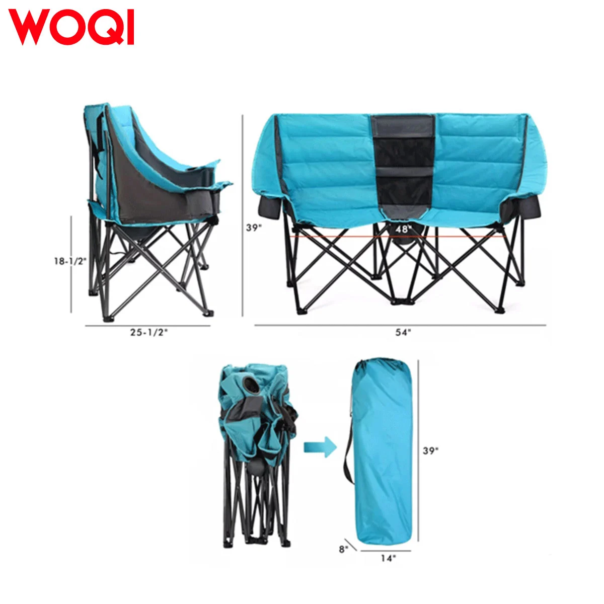 Double Comfort — This double-layer camping chair features a wide open design, measuring 54 inches wide x 25-1/2 inches deep x 39 inches high (approximately 139.4 cm) with an extra-wide padded double seat width of 48 inches (approximately 122.4 cm). Our double camping chair invites you to enjoy wonderful moments with your loved one.