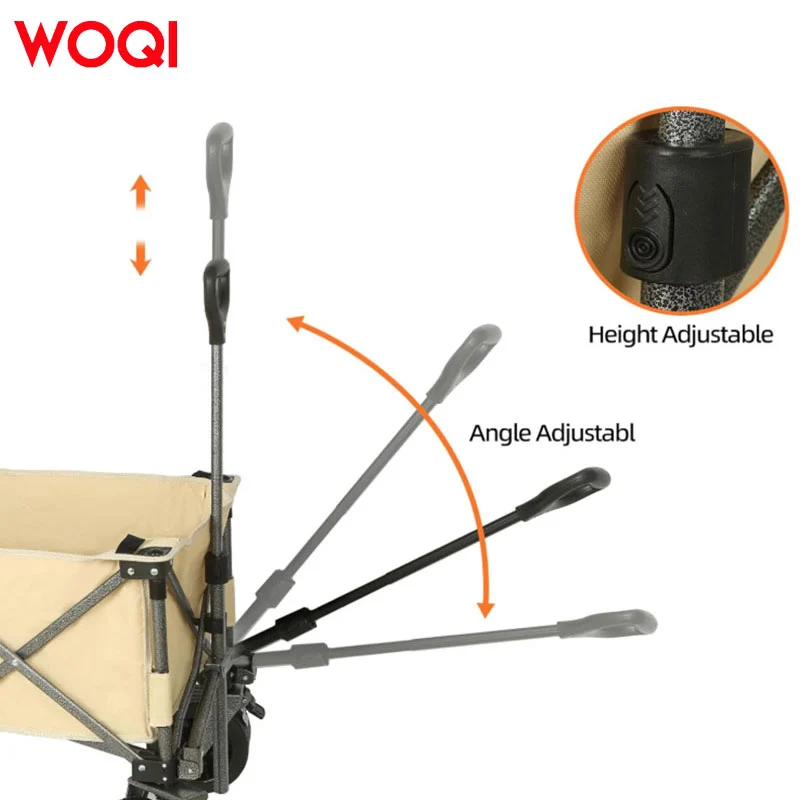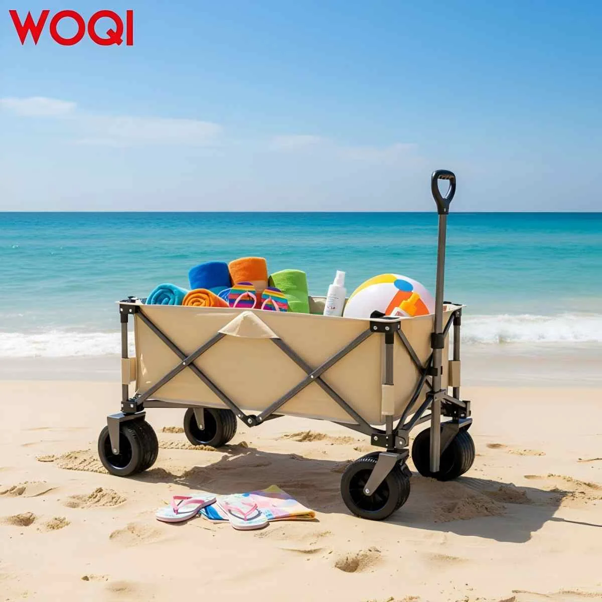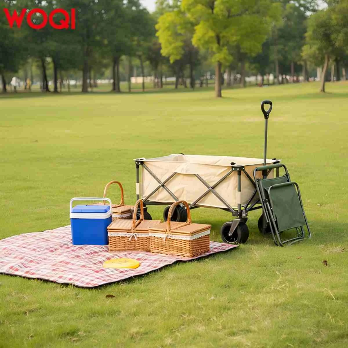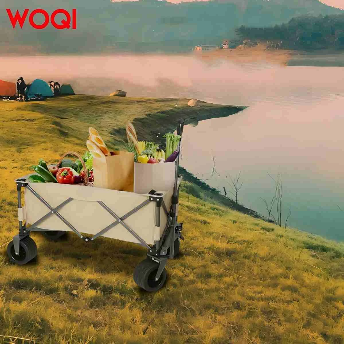 All-terrain adaptability and large-capacity loading: The travel trolly cart is equipped with all-terrain off-road wheels, which can travel freely in various complex terrains such as grass, beaches, gravel roads and rugged mountain roads. At the same time, the loading capacity meets the needs of campers to carry a large amount of equipment and items, making the camping trip easier.
